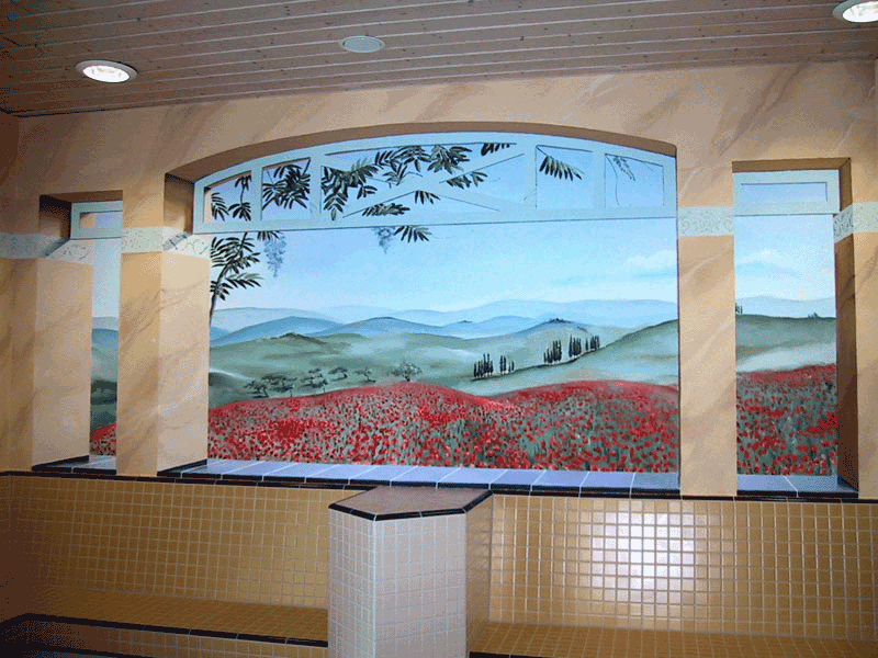 Wärmebänke Blick durch den Blauregen auf toskanische Mohnwiesen.